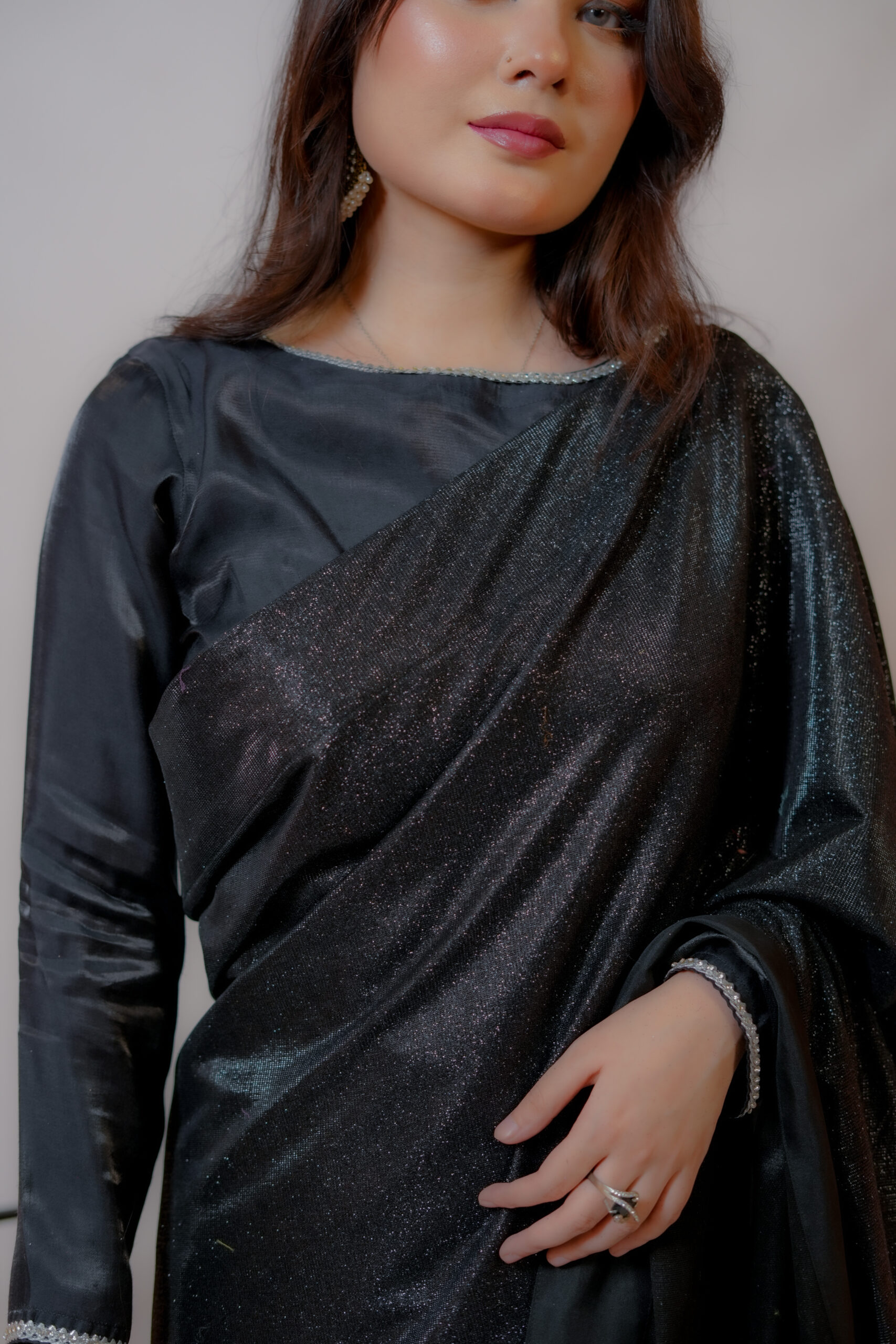 The soft shimmer of moonlight fabric paired with a delicate silver and lilac purple hue creates an ethereal look perfect for evenings, festive occasions, and elegant celebrations.